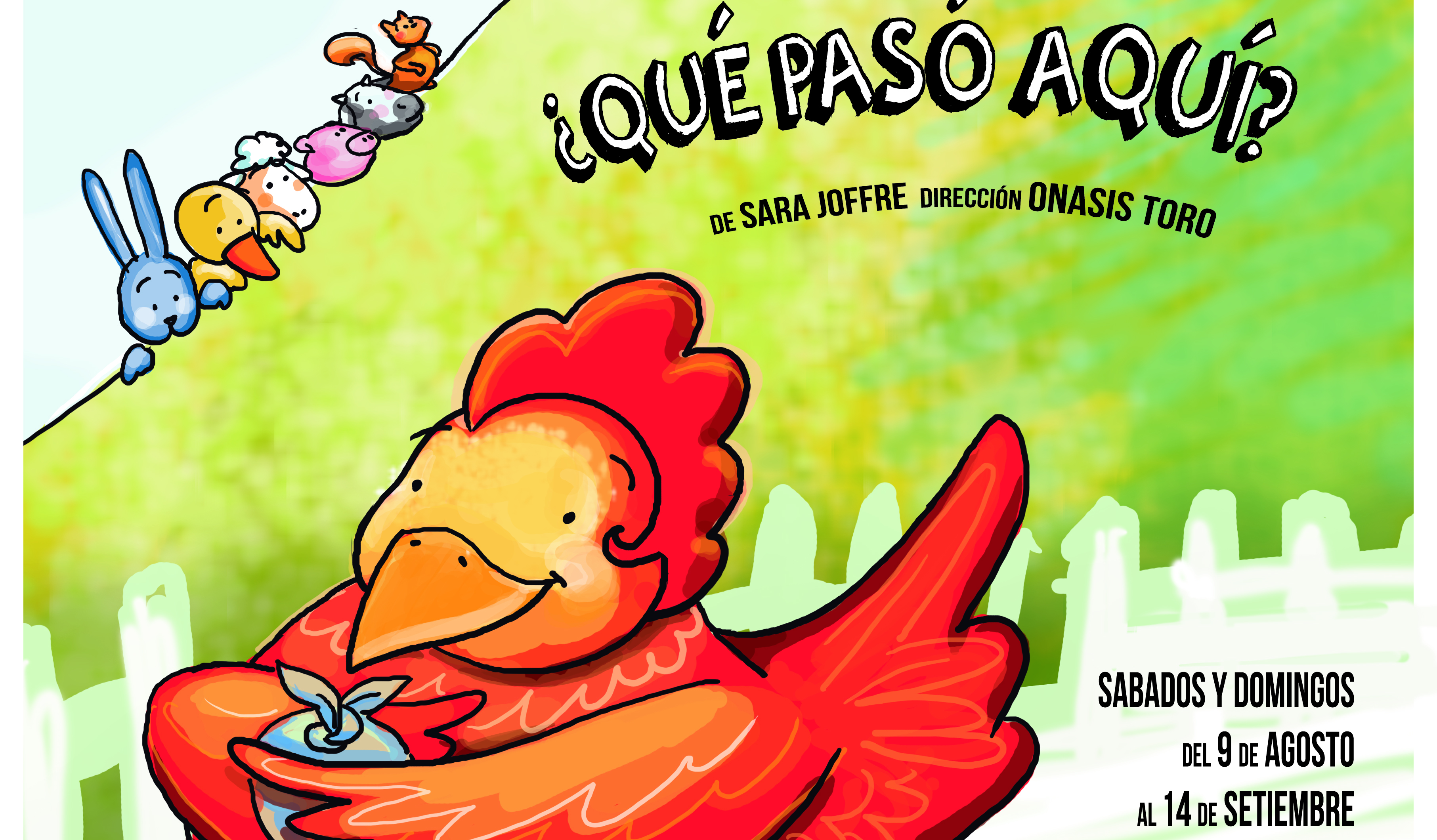 «Cocorocó, Quiquiriquí… ¿Qué pasa aquí?» es dirigida por Onasis Toro (actor y pedagogo teatral egresado de la Escuela Nacional Superior de Arte Dramático y fundador de la Asociación Cultural MANITAS). Actúan Carla Rojas, Zadith Prada, Sergio Ota y Rodrigo Nuñez.