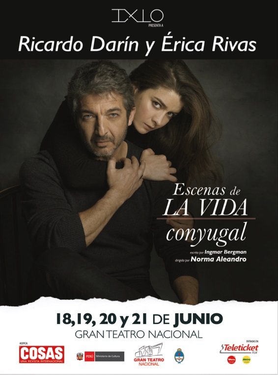 Ricardo Darín y Érica Rivas llegarán a Lima para protagonizar Escenas de la vida conyugal en una corta temporada, que irá del 18 al 21 de junio, en el Gran Teatro Nacional, bajo la dirección de la primera actriz argentina Norma Aleandro. La obra, que ha sido catalogada como “la comedia dramática que cambió para siempre el concepto de la palabra matrimonio”, ya ha sido vista por más de 150 mil espectadores solo en Argentina.