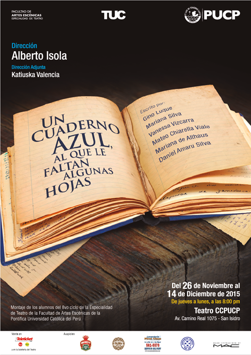 Los textos que forman parte de «Un cuaderno azul (al que le faltan algunas hojas)» fueron escritos teniendo en cuenta estos elementos: un objeto (el cuaderno azul que le da título al montaje), una ciudad (Lima) y una fecha (cualquiera que abarque entre los años 1940 al 2015). Seis de los mejores dramaturgos peruanos de nuestros tiempos fueron los que aceptaron la misión y el resultado podrá ser visto desde el jueves 26 de noviembre en un singular montaje dirigido por Alberto Ísola y representado por los egresados de la especialidad de Teatro de la Facultad de Artes Escénicas de la Universidad Católica (el TUC).